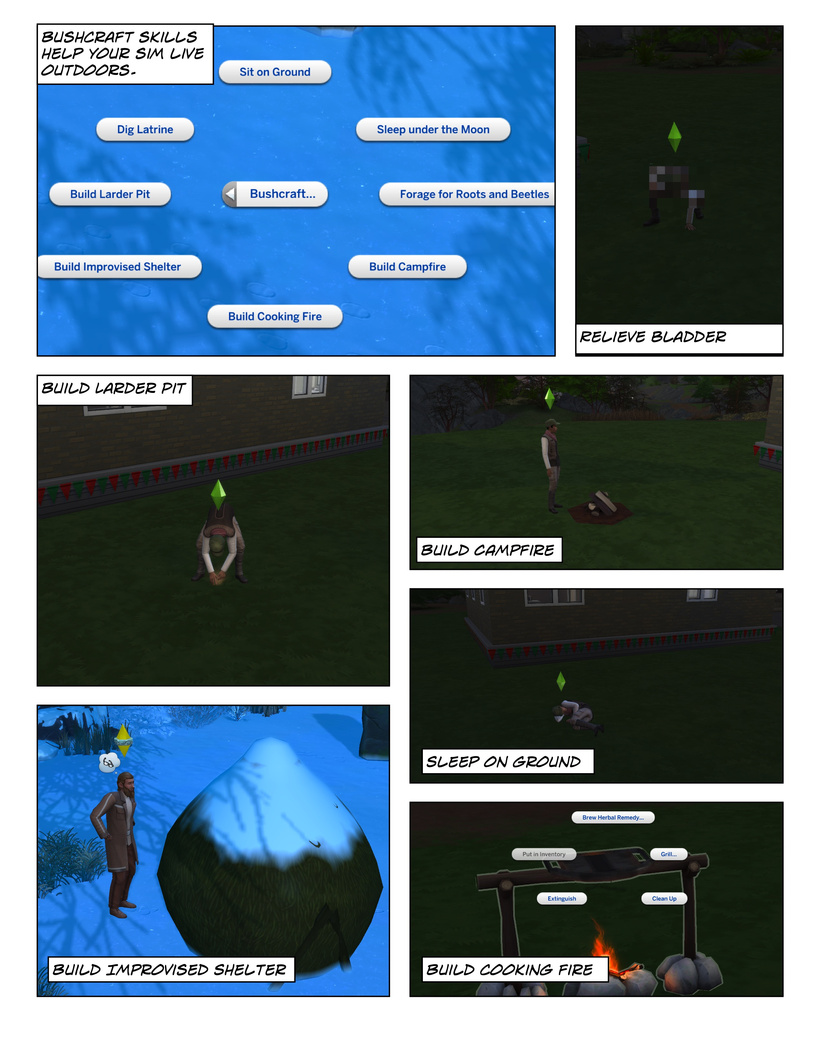 There is some duplication between Bushcraft and the Enchanted by Nature’s “Natural Living” skill, but they have a different focus as you gain skill levels. Natural Living helps your sim live outdoors like Bigfoot. Bushcraft is geared toward becoming an experienced camper who would rather build a fire and cook their food than eat everything raw and sleep on the ground.