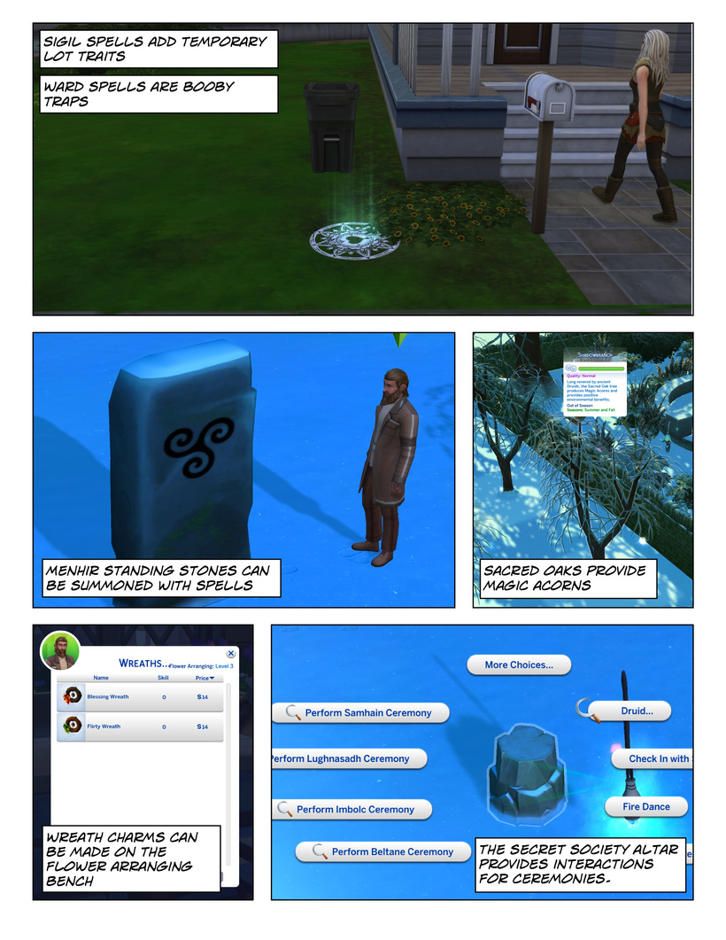 Sacred oak trees are sentient trees that serve as guardians of a Druid’s grove. Sims can talk to them, build relationships with them, they have names, and increase the quality of the natural environment in the nearby area. They also increase the chances of Pooka spawning.